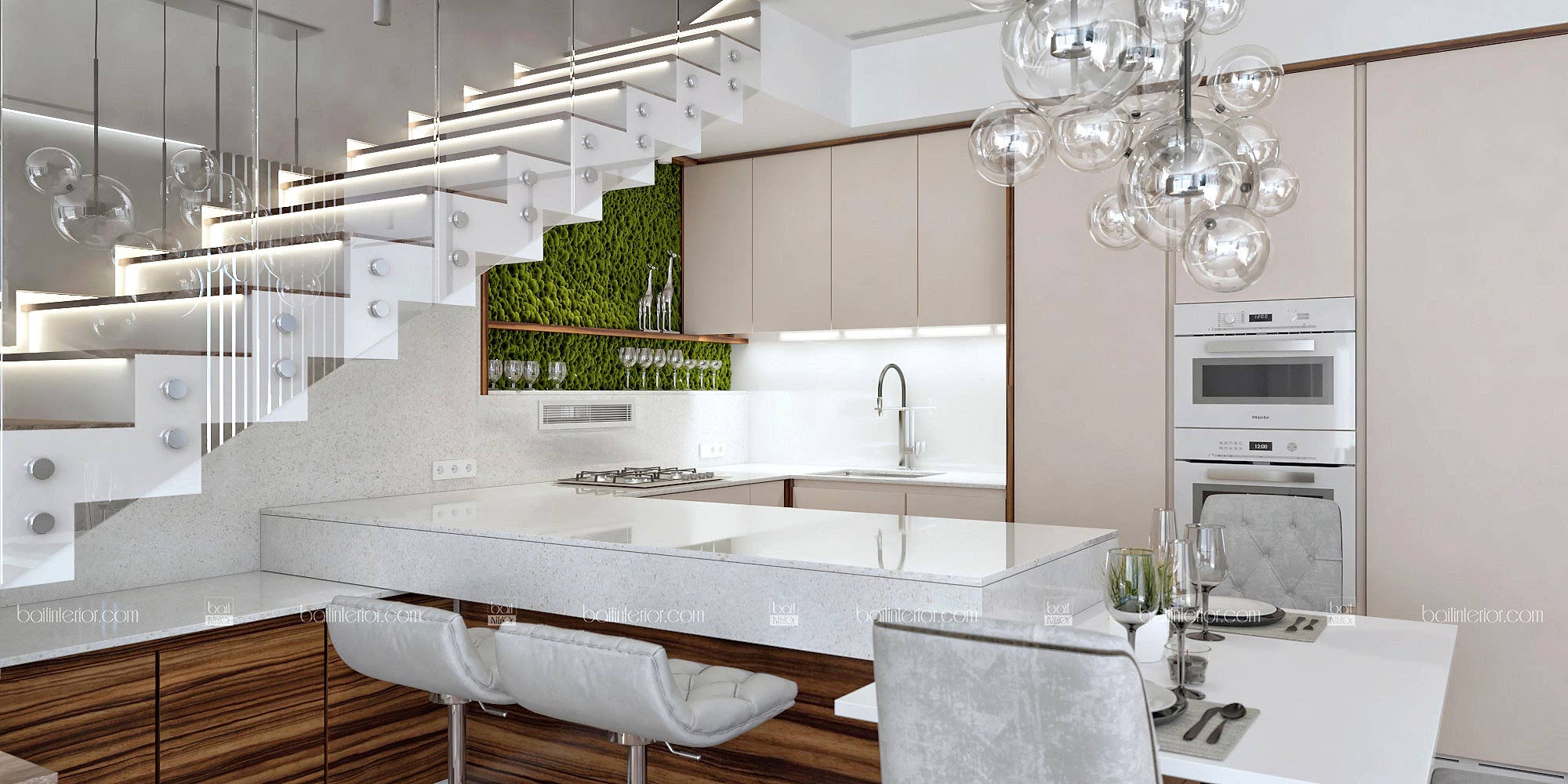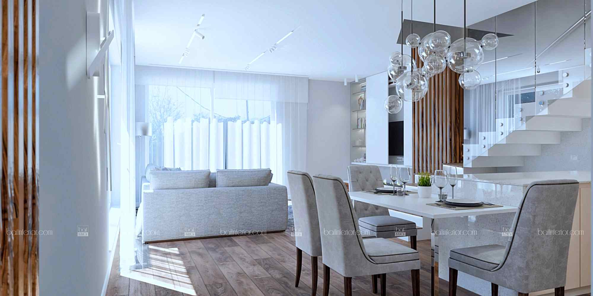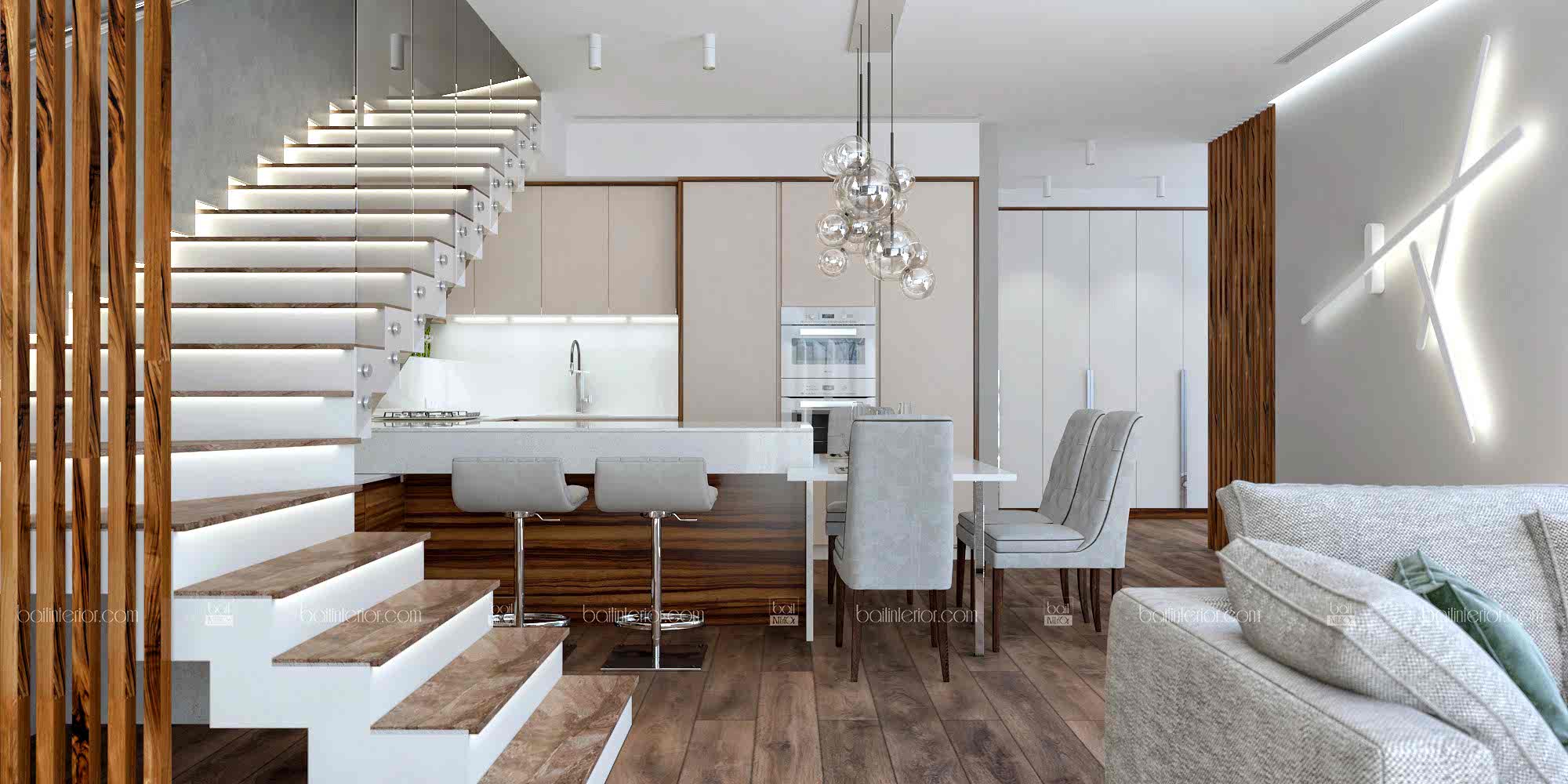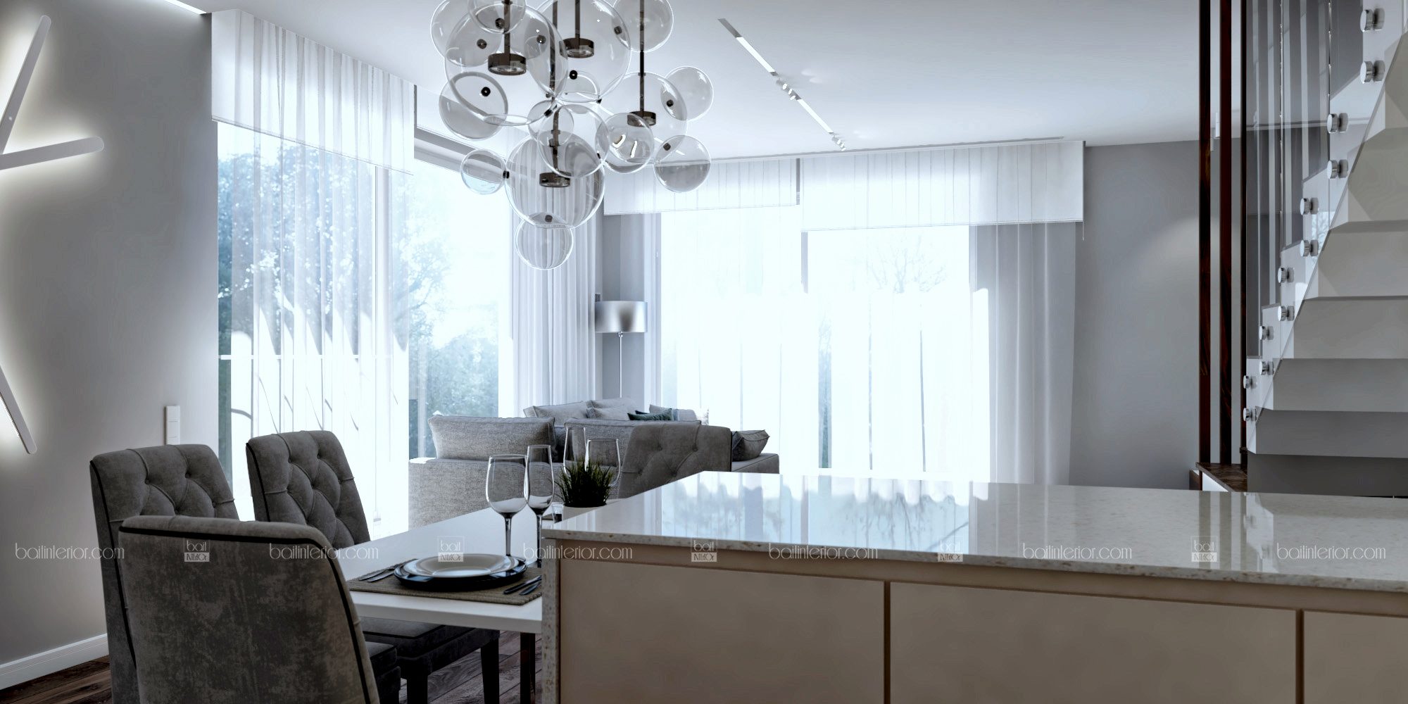 Проект интерьера этого прекрасного дома создавался специально для молодой пары. Панорамные окна стали настоящей изюминкой на торте для минималистичного стиля. Самой сложной задачей было разместить все необходимые зоны в уже построенном доме. Однако мы с ней успешно справились следующим образом: предложили достроить фрагмент стены, чтобы отделить зону прихожей от основного помещения. Потрудились мы и над столом, чтобы сделать обед, ужин или, тем более, завтрак максимально комфортными. Необходимо было сократить занимаемое им место, поэтому стол выступил элегантным продолжением кухонного полуострова (зоны завтраков). Иначе говоря, наши дизайнеры кропотливо Pin-Up над проектом, чтобы прекрасные виды каждый день открывались не только за окном, но и внутри дома.