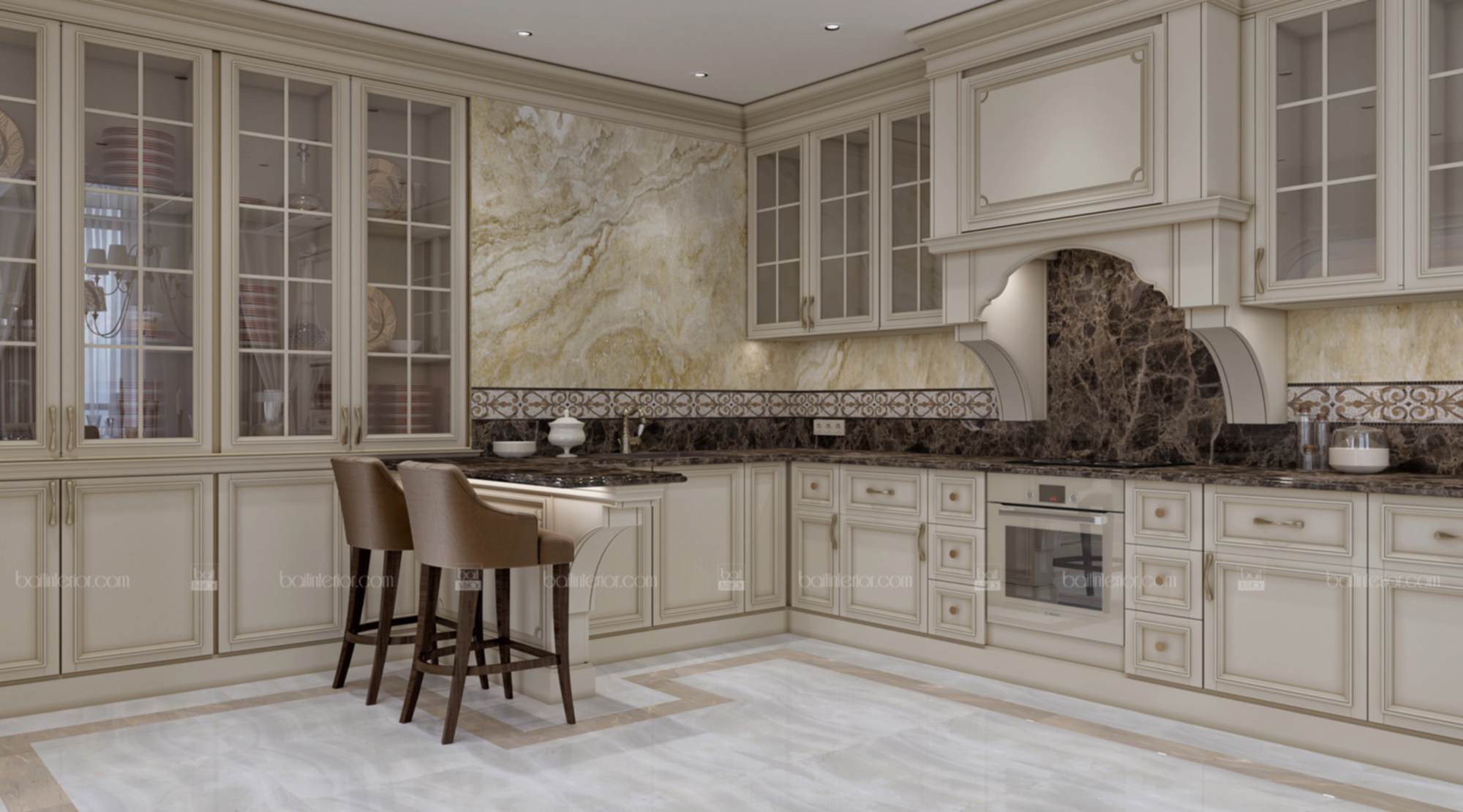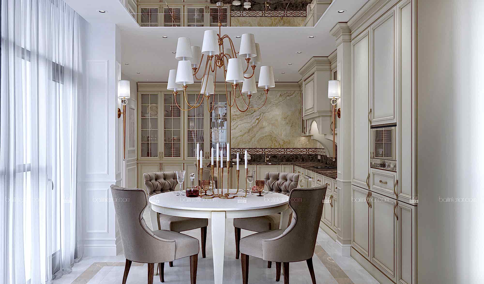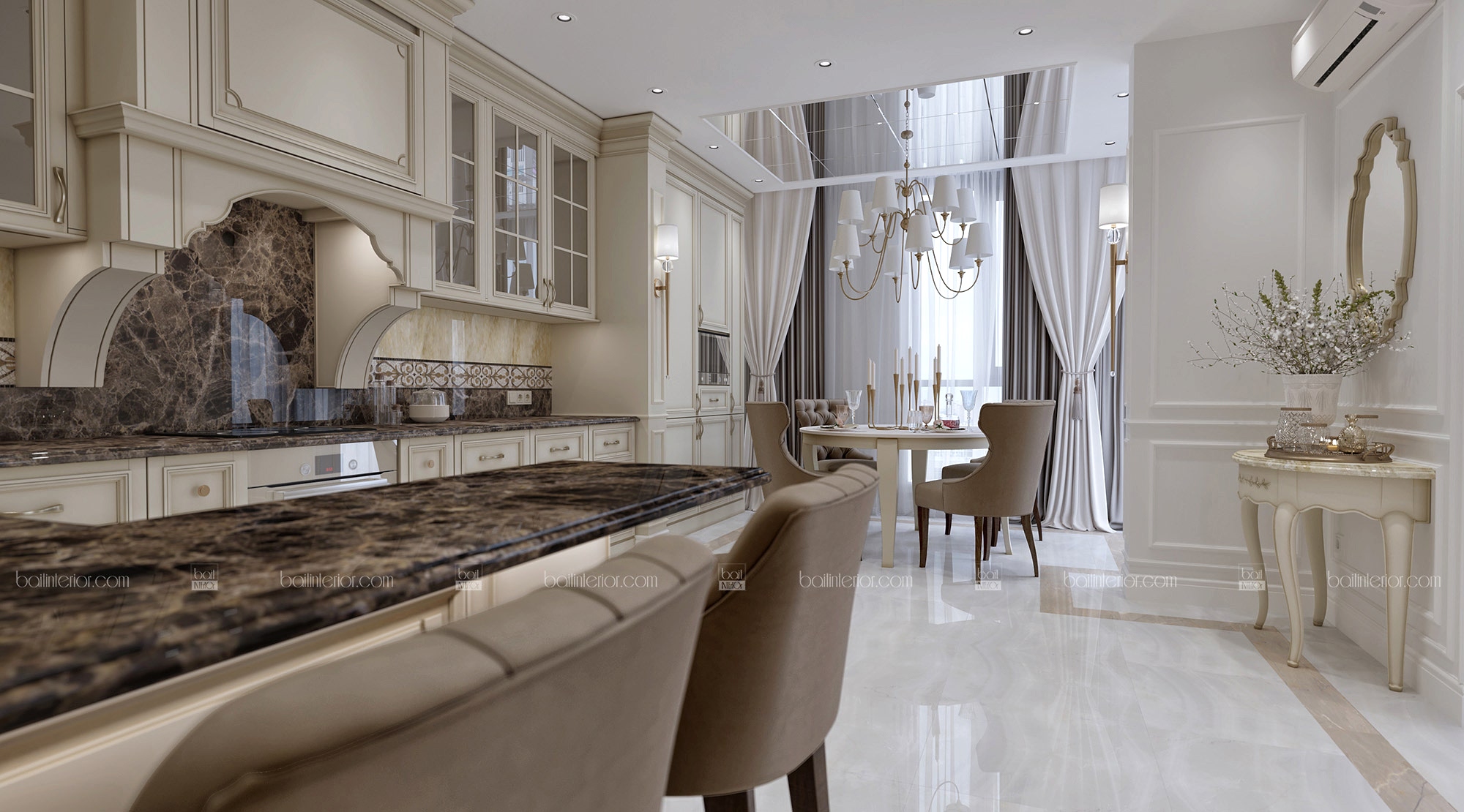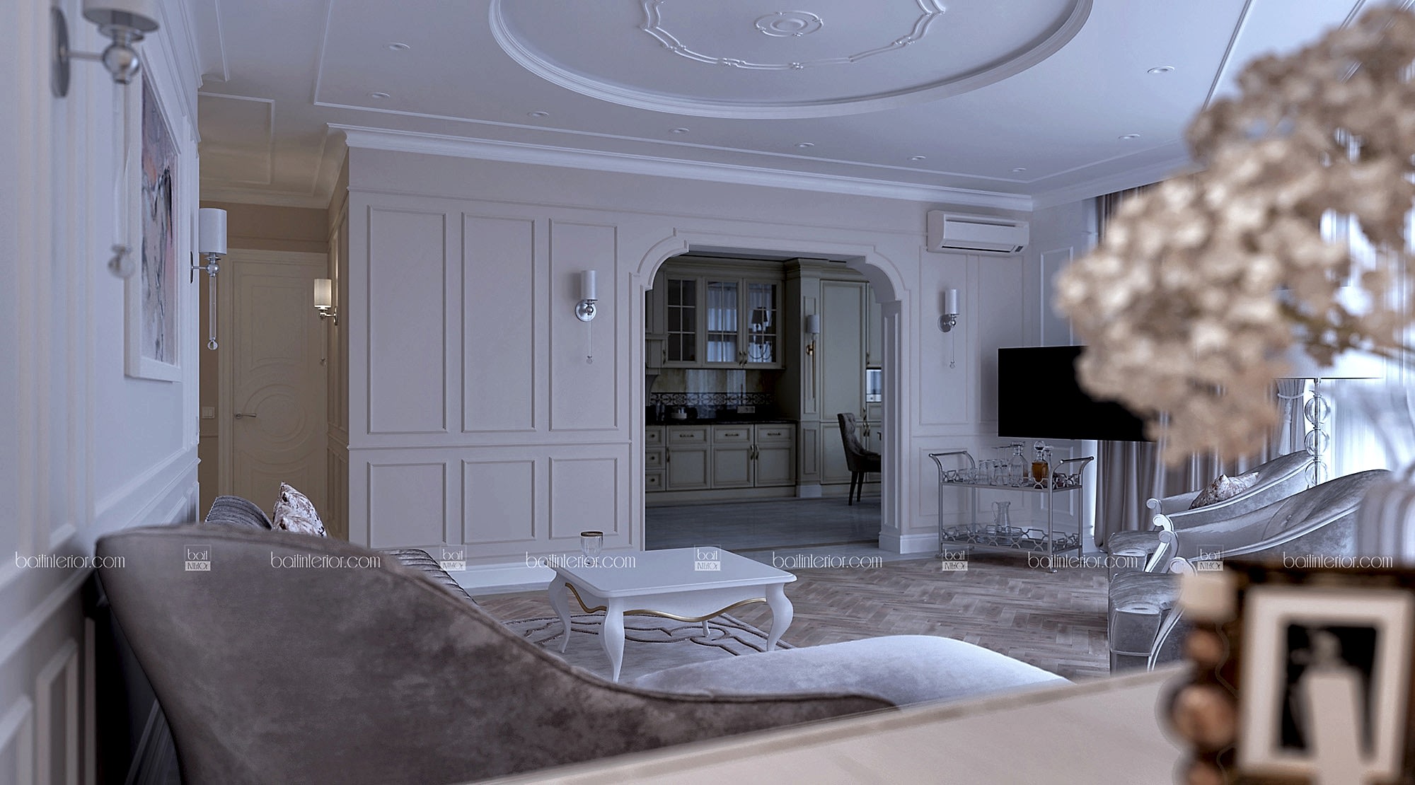 Гостиную не стали отделять от зоны кухни, поэтому зонировали пространство при помощи фигурной арки, обрамленной молдингами. Чтобы леди смогли по достоинству насладиться шикарным видом, мы объединили кухню с прилегающим к ней балконом. В результате, у нас получилась органичная столовая группа с видом на город. К сожалению, в жилом комплексе достаточно низкие потолки, поэтому пришлось довольствоваться стандартными сплит-системами. Однако мы постарались разместить внутренние блоки таким образом, чтобы их было незаметно невооружённому глазу.