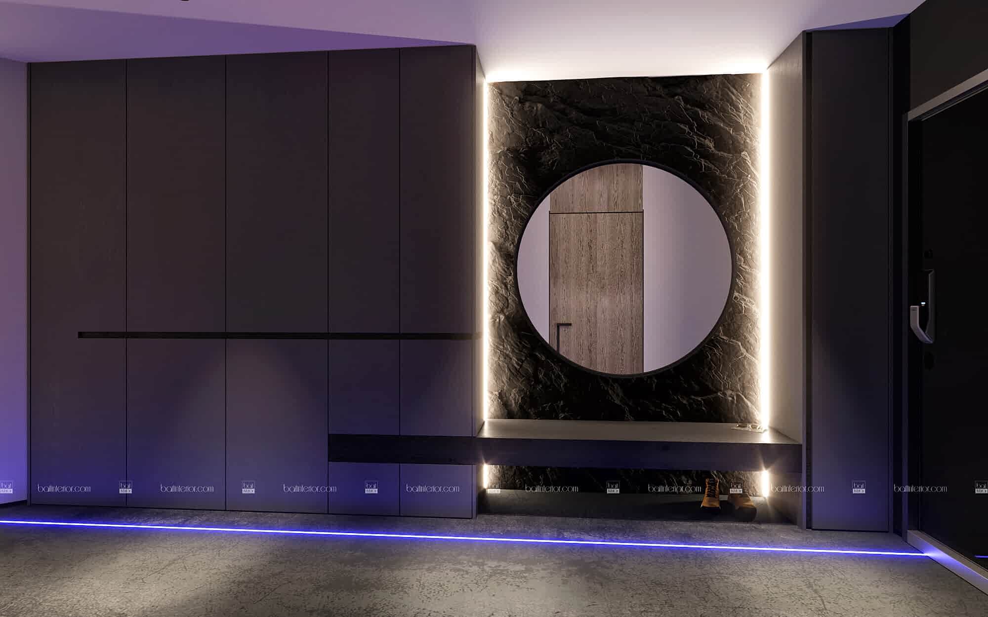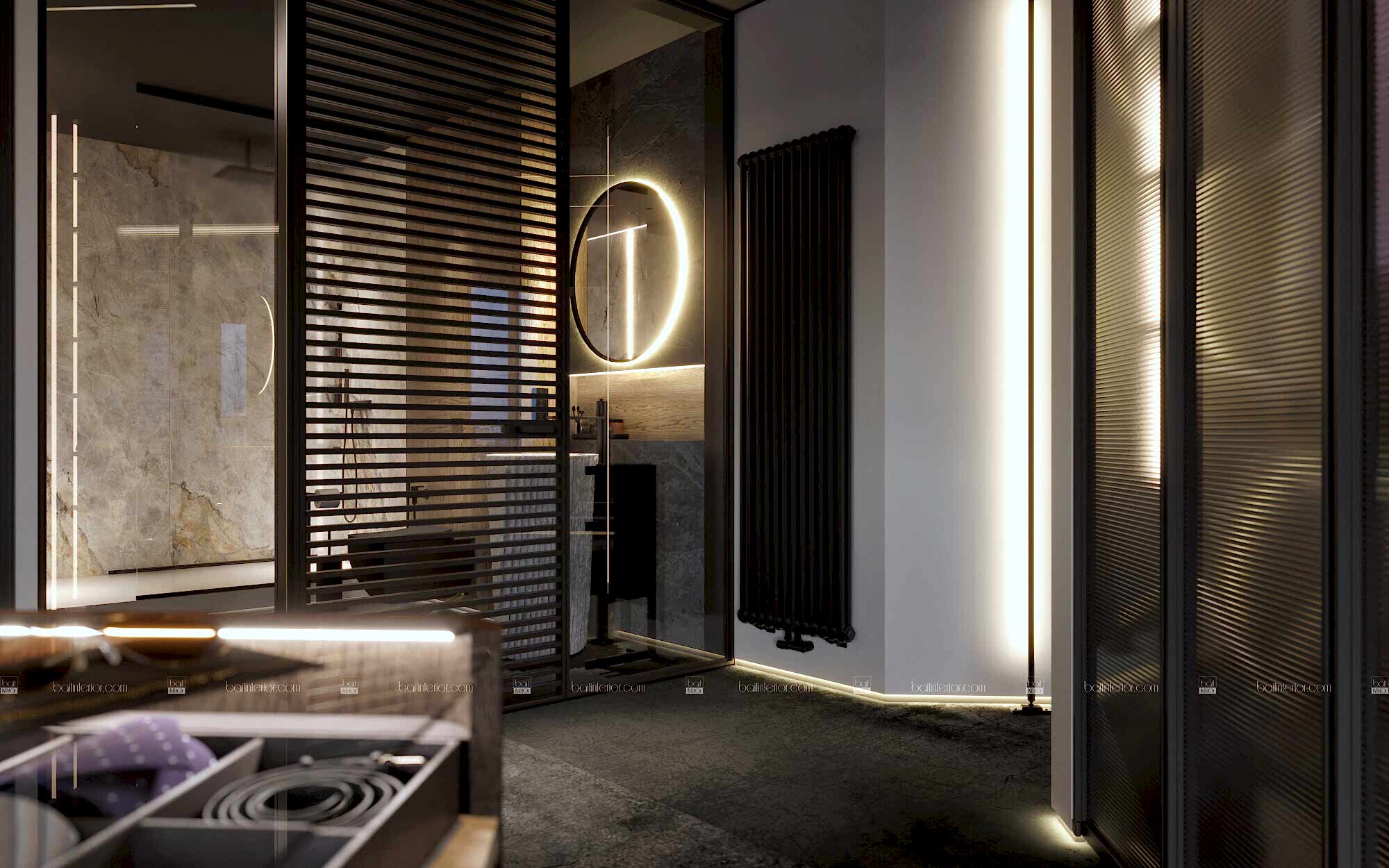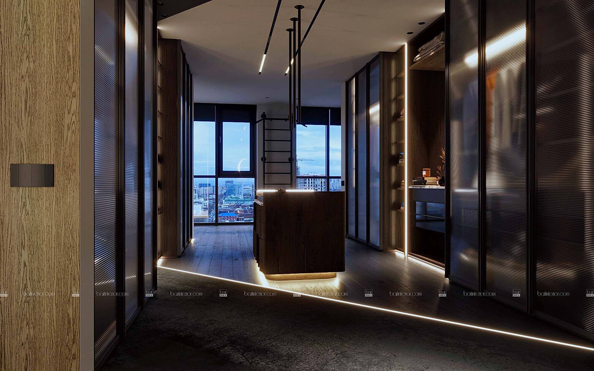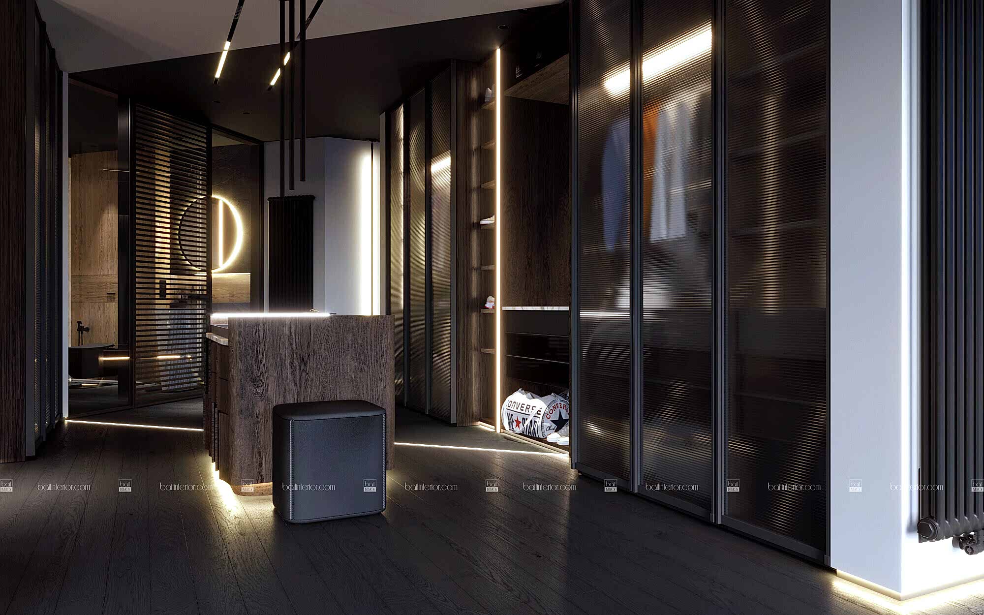 Проникая вглубь интерьера, мы оказываемся в просторной гардеробной комнате, где по центру располагается удобный остров для хранения аксессуаров. В Pin-Up гардероба использованы благородные натуральные материалы: деревянный шпон, природный камень и рифленое стекло, что придает пространству особую элегантность и роскошь.