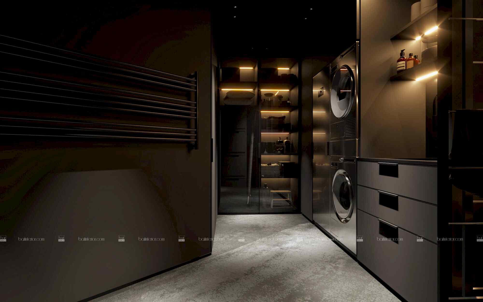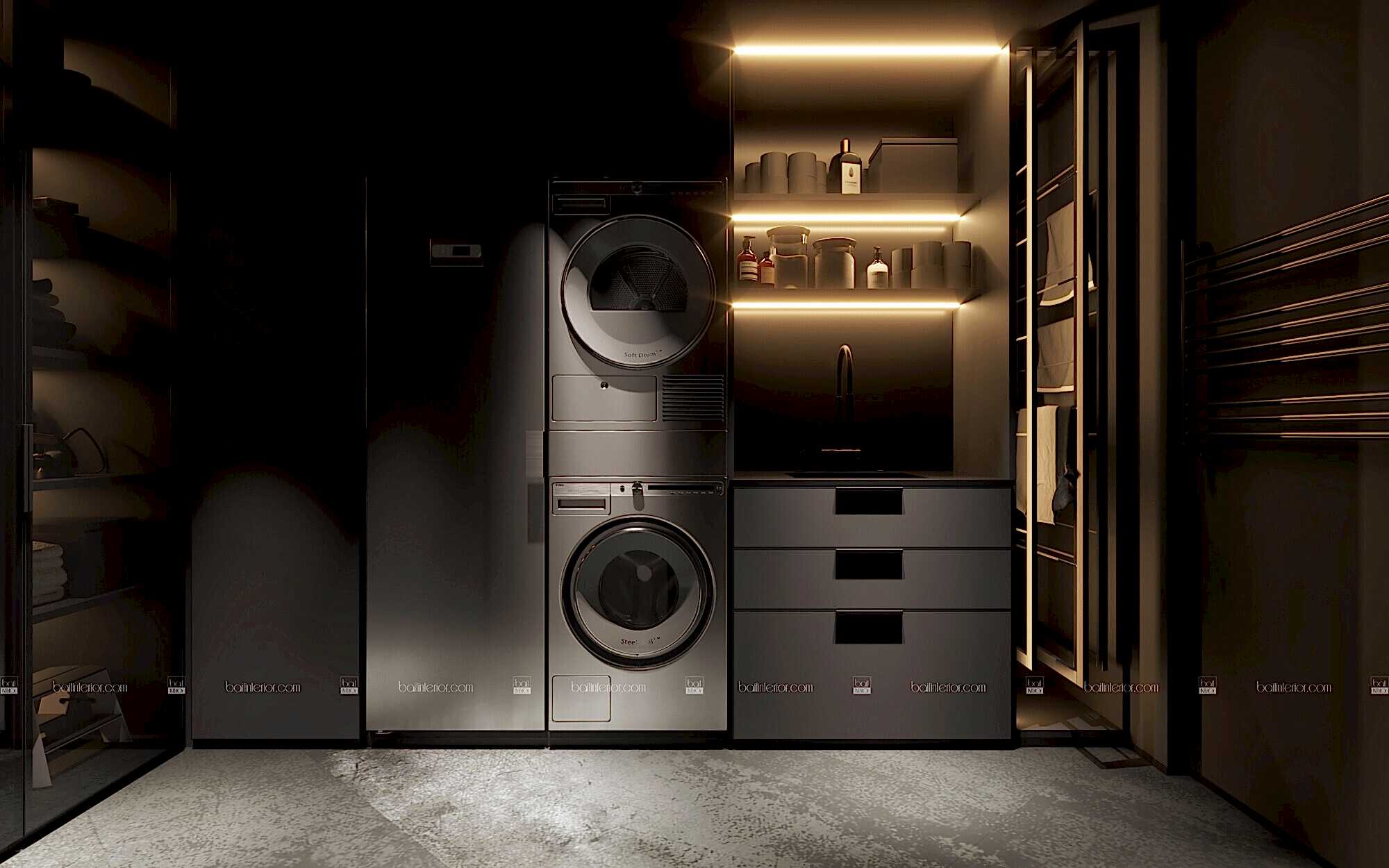 Техническую зону мы создали в общей концепции интерьера. Здесь удобно расположились все Pin-Up узлы, которые требуют регулярного обслуживания, зона для грязного и чистого белья, стиральная и сушильная машинка, и конечно же, сушильный шкаф.