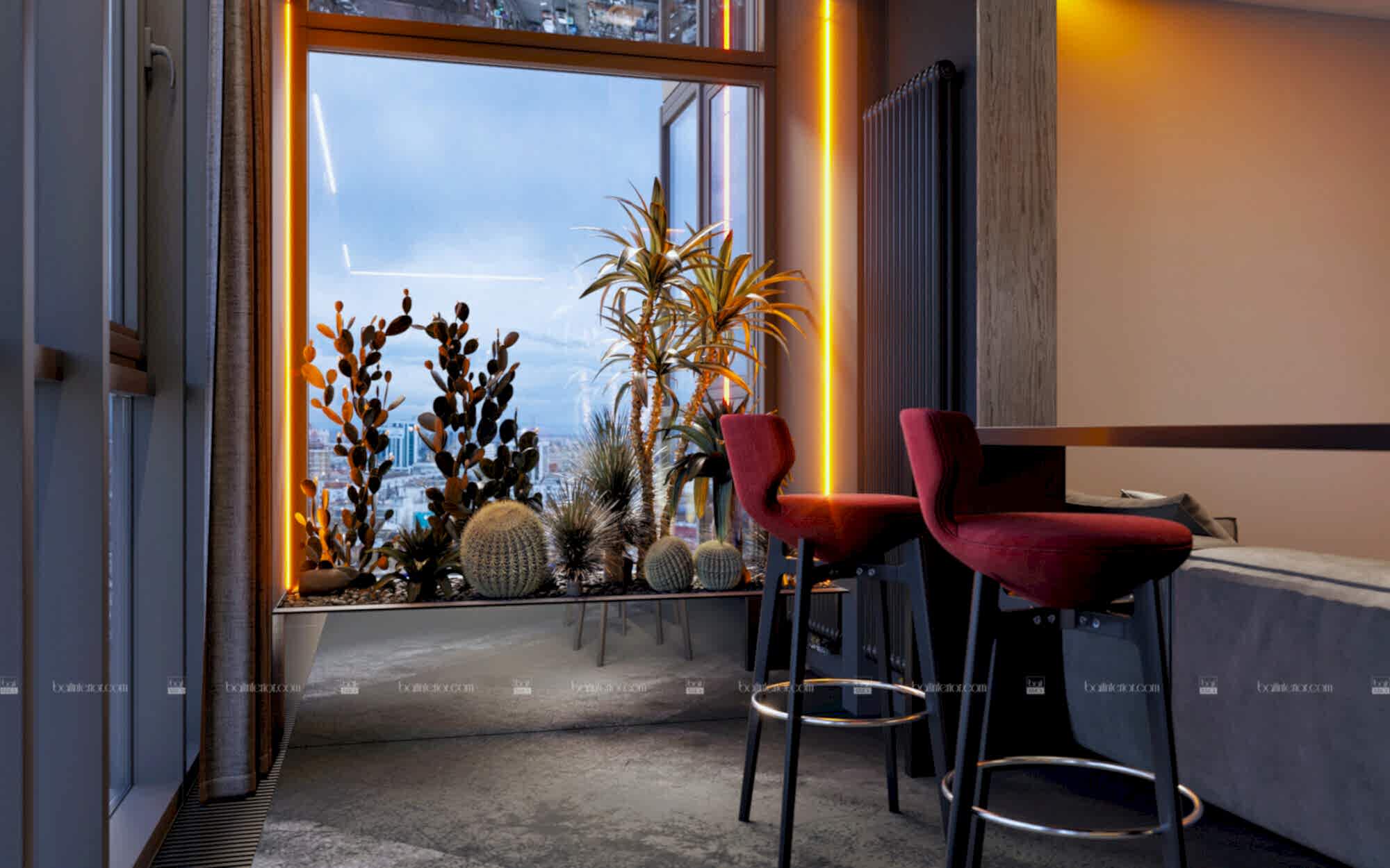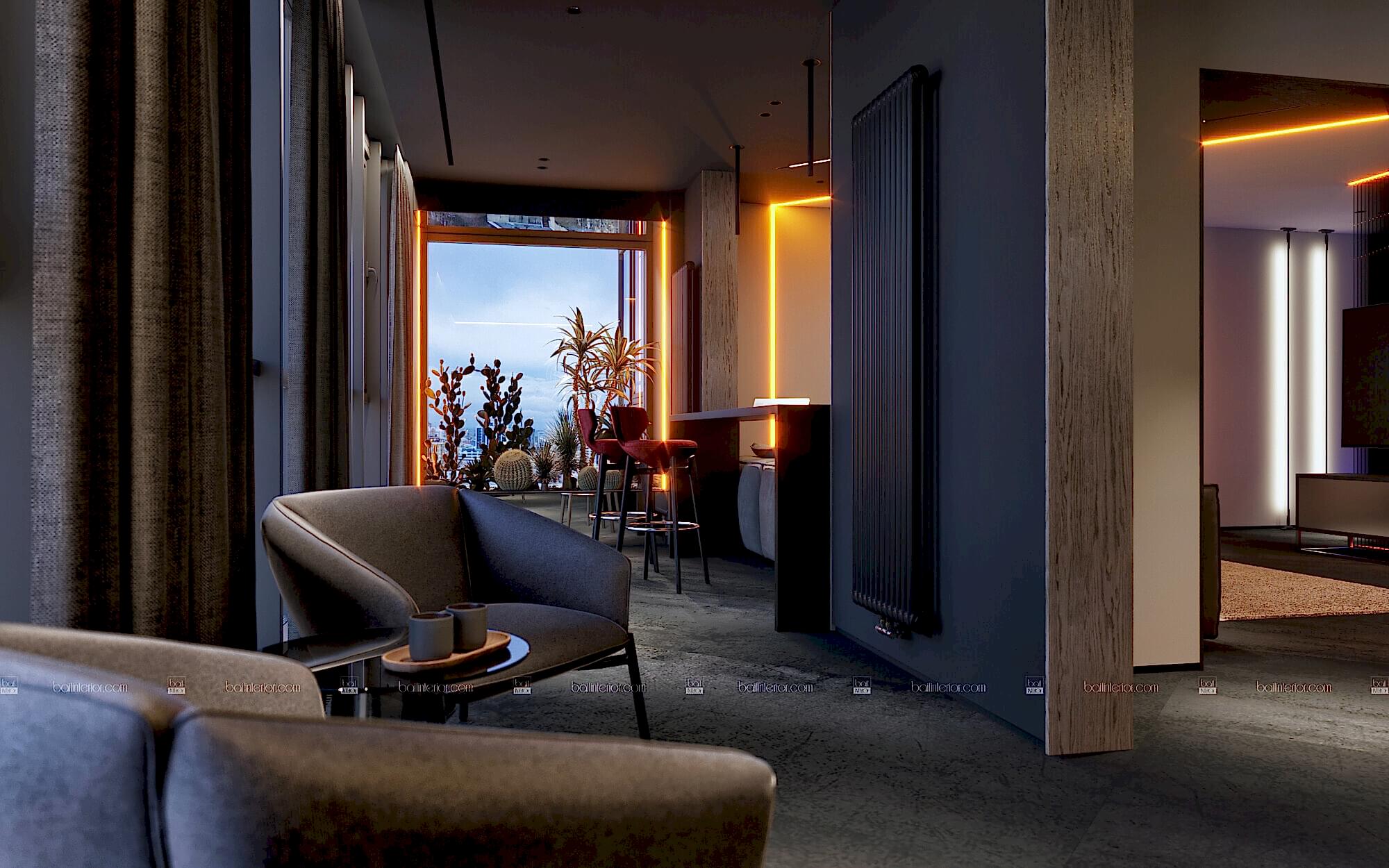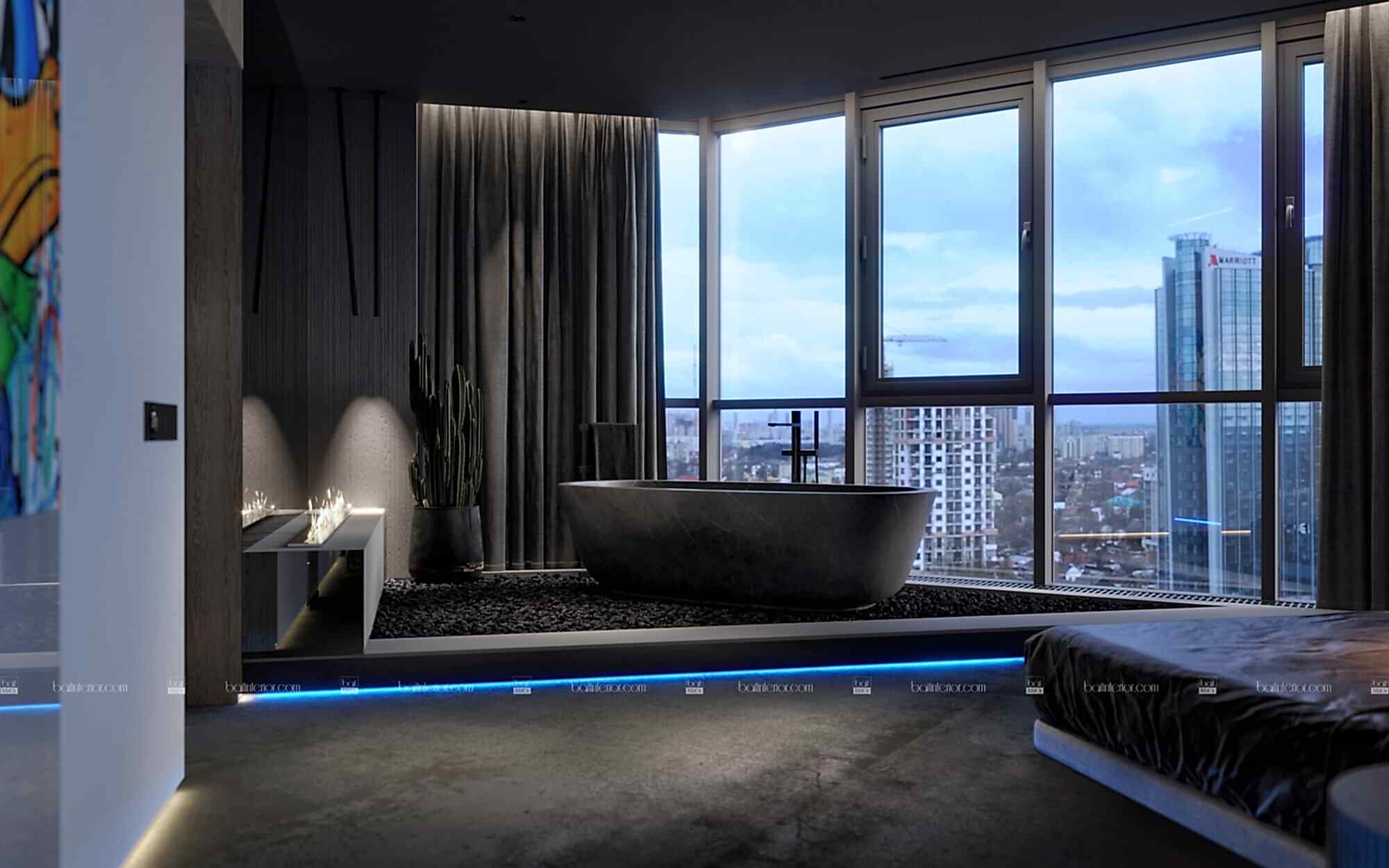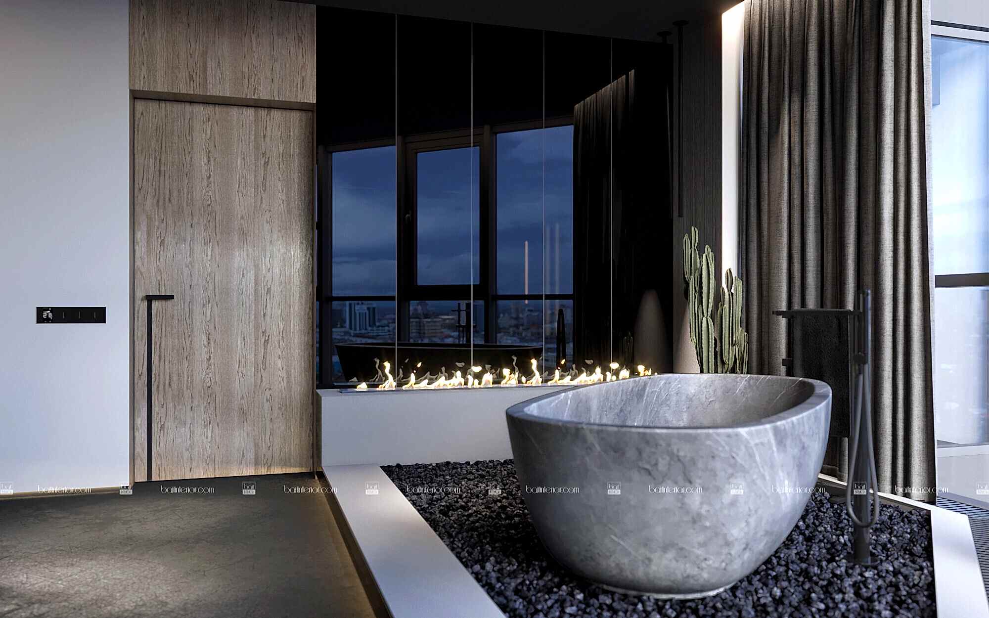 Особую изюминку этому интерьеру придает Pin-Up из цельного камня - величественный предмет роскоши, в котором так приятно расслабиться. Представьте себе: вы нежитесь в теплой воде, вслушиваясь в умиротворяющий треск огня, а за окном открывается завораживающий вид на городской пейзаж.