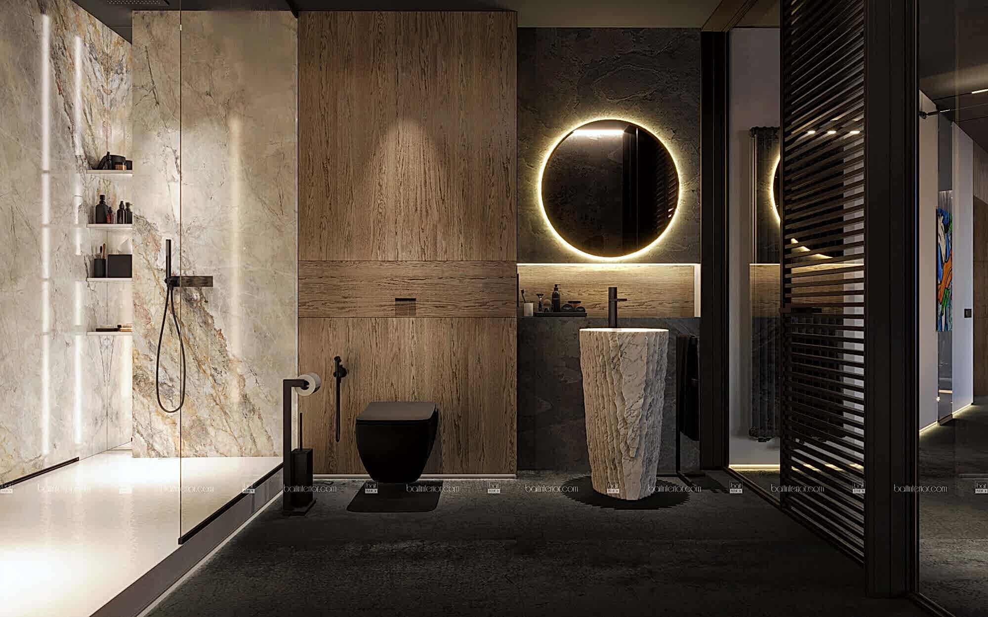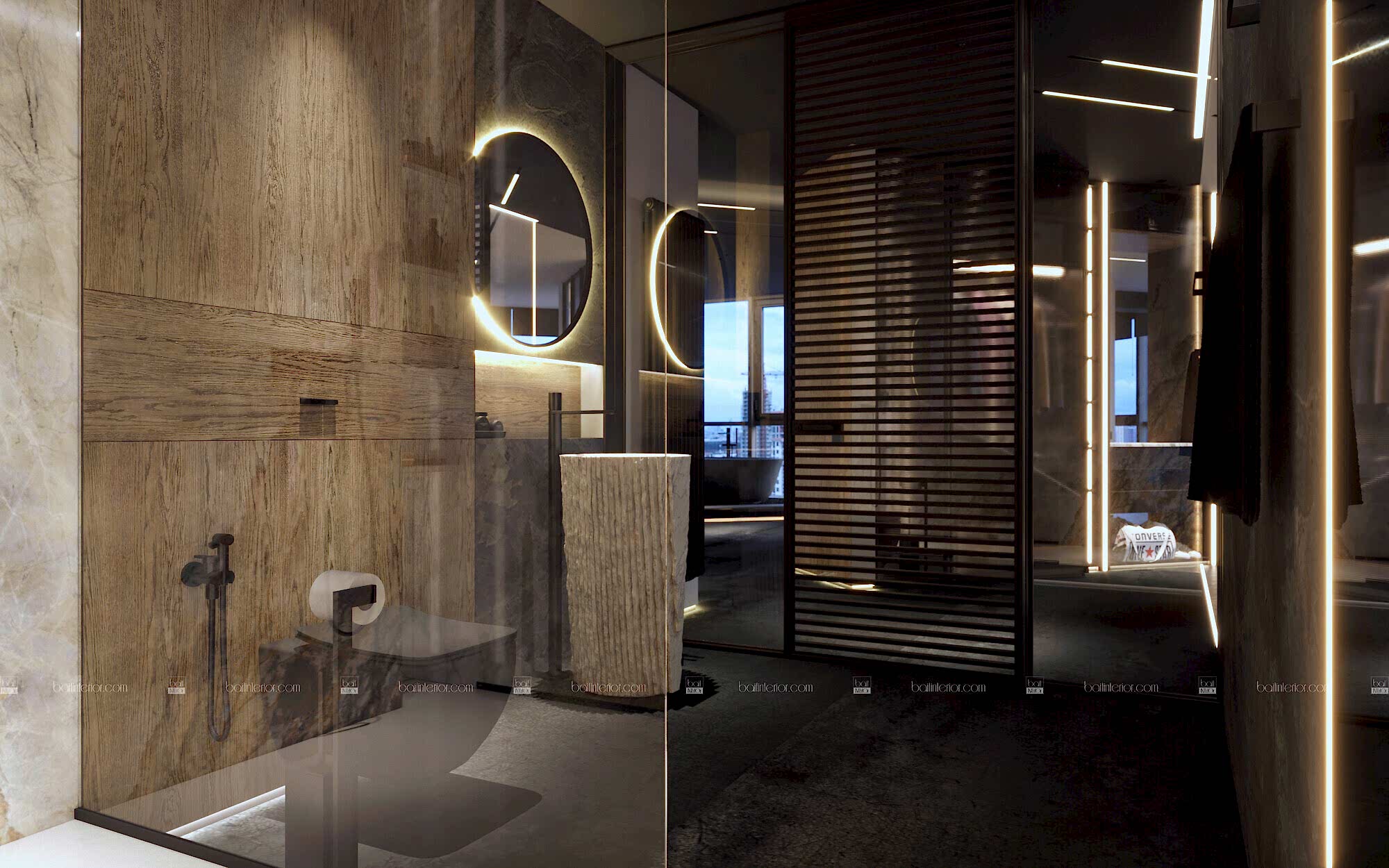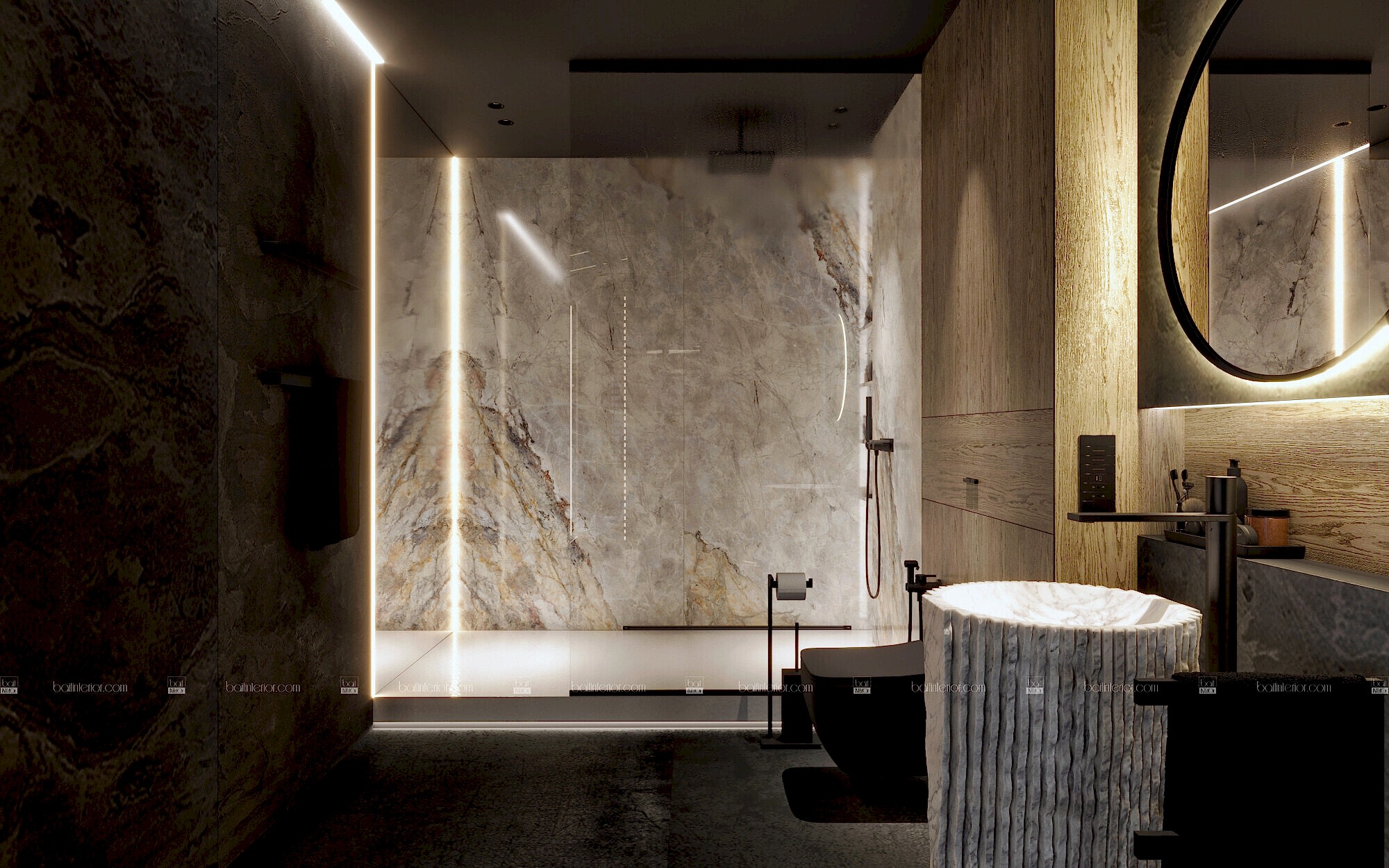 Хозяйская душевая продолжает общую концепцию интерьера и элегантно отделена стеклянной Pin-Up с эффектом переменной прозрачности. Особого внимания заслуживает впечатляющая раковина, выполненная из цельного куска мрамора, которая становится центральным акцентом пространства.