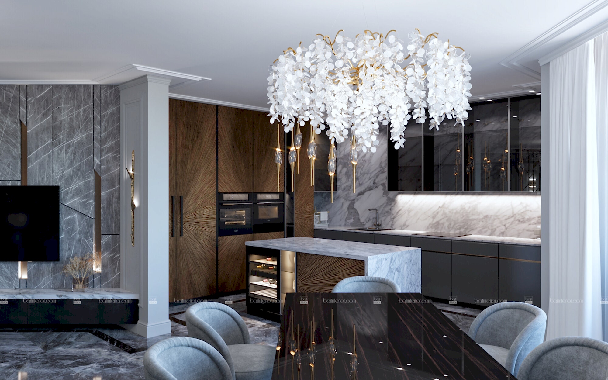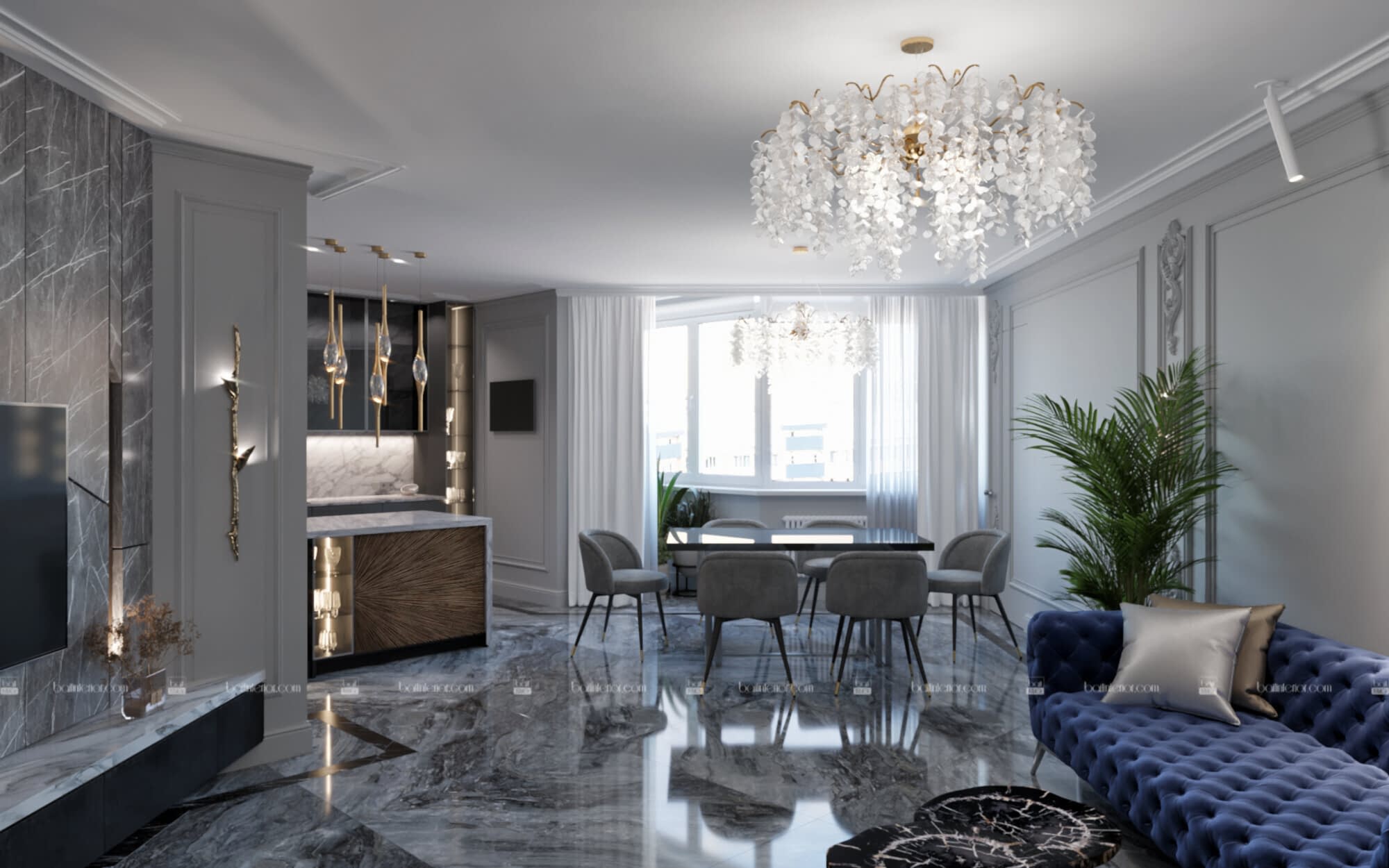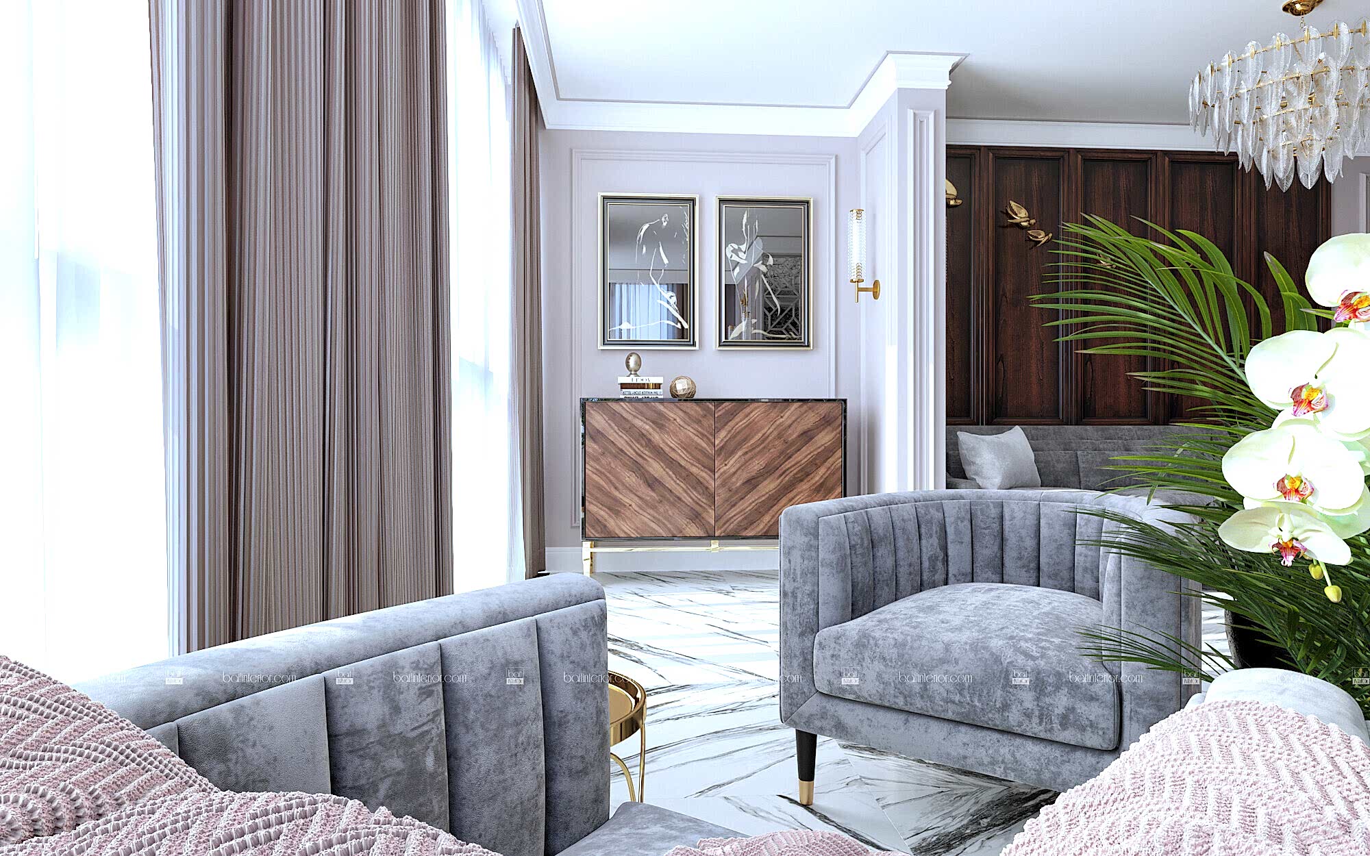 Задачей от заказчиков при создании этого интерьера было создание квартиры, которая бы воплощала роскошь и стиль, сравнимый с “Bently”. Им особенно по вкусу пришлась серая гамма, которая стала основой для всего дизайна. Крупноформатный глянцевый керамогранит, натуральная латунь и изящная гипсовая лепнина создали основной образ помещений, придавая им элегантность и утонченность. А серый цвет стал Pin-Up фоном для латунных элементов и предметов мебели, добавляя интерьеру изысканности и глубины.
