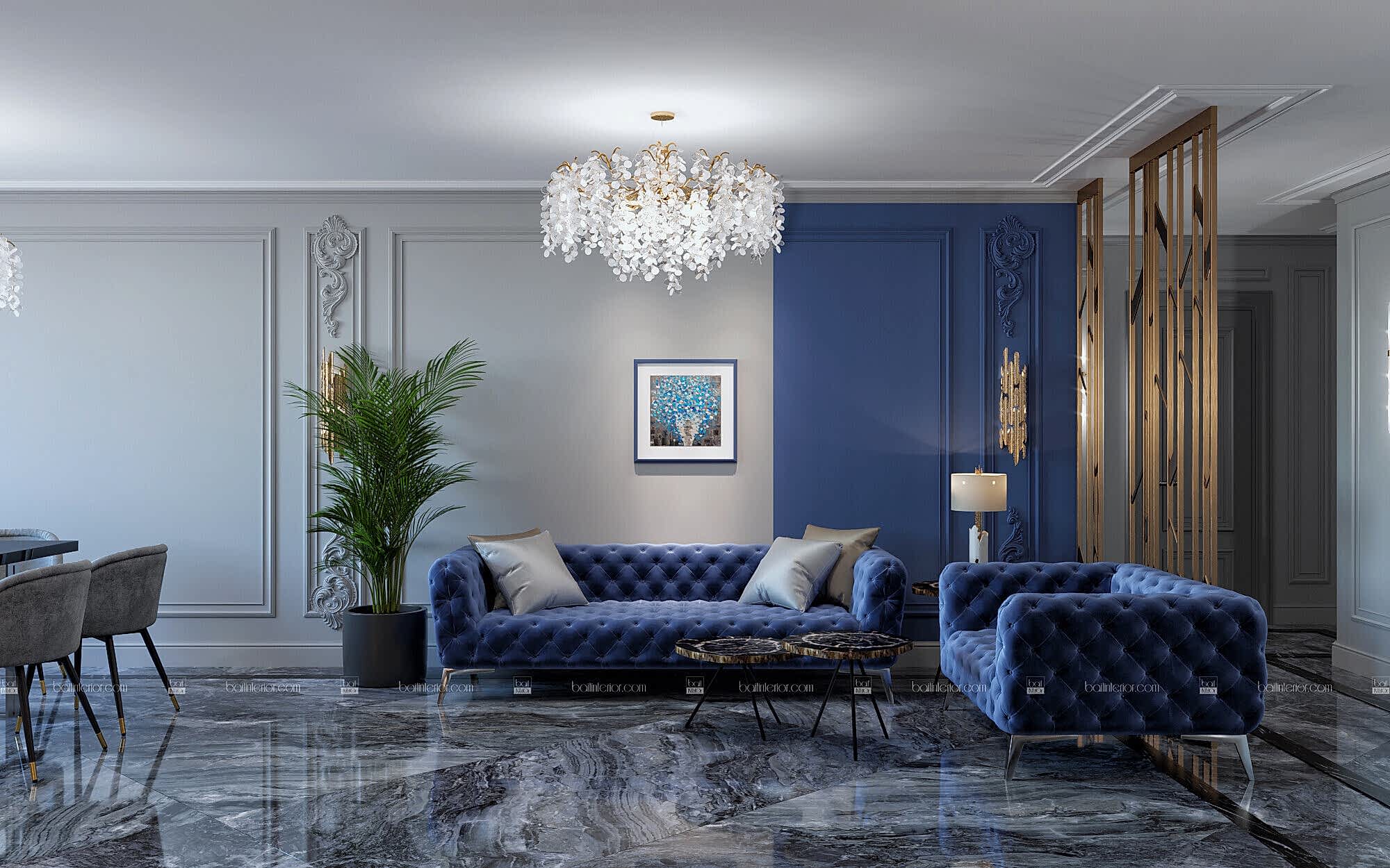 Современности и динамичности дизайну придает ассиметричное расчленение стены, выкрашенной в насыщенный синий цвет, который гармонично поддерживает цветовую палитру мягкой мебели. Этот акцент добавляет живости и интереса, создавая баланс между Pin-Up и современным стилями.