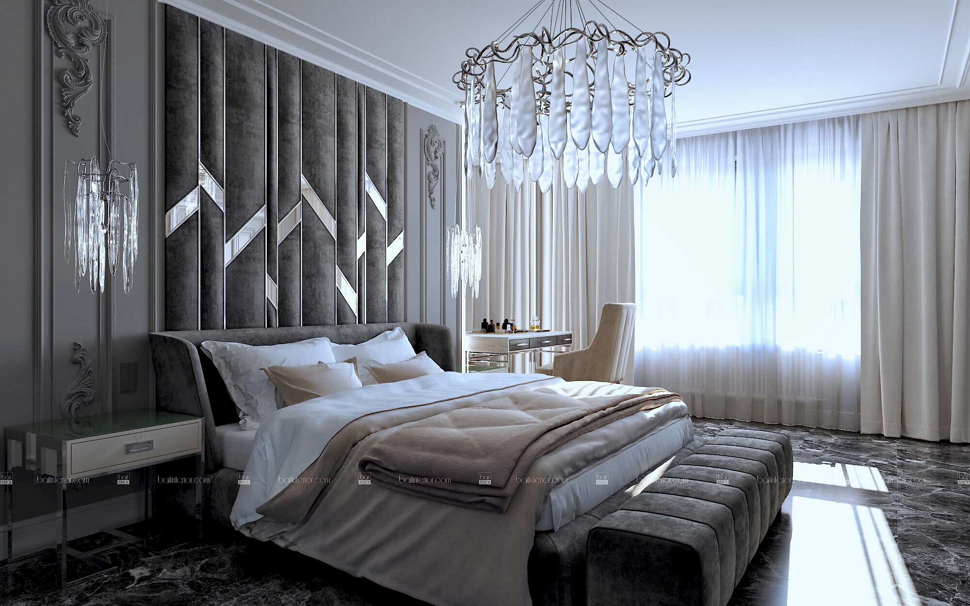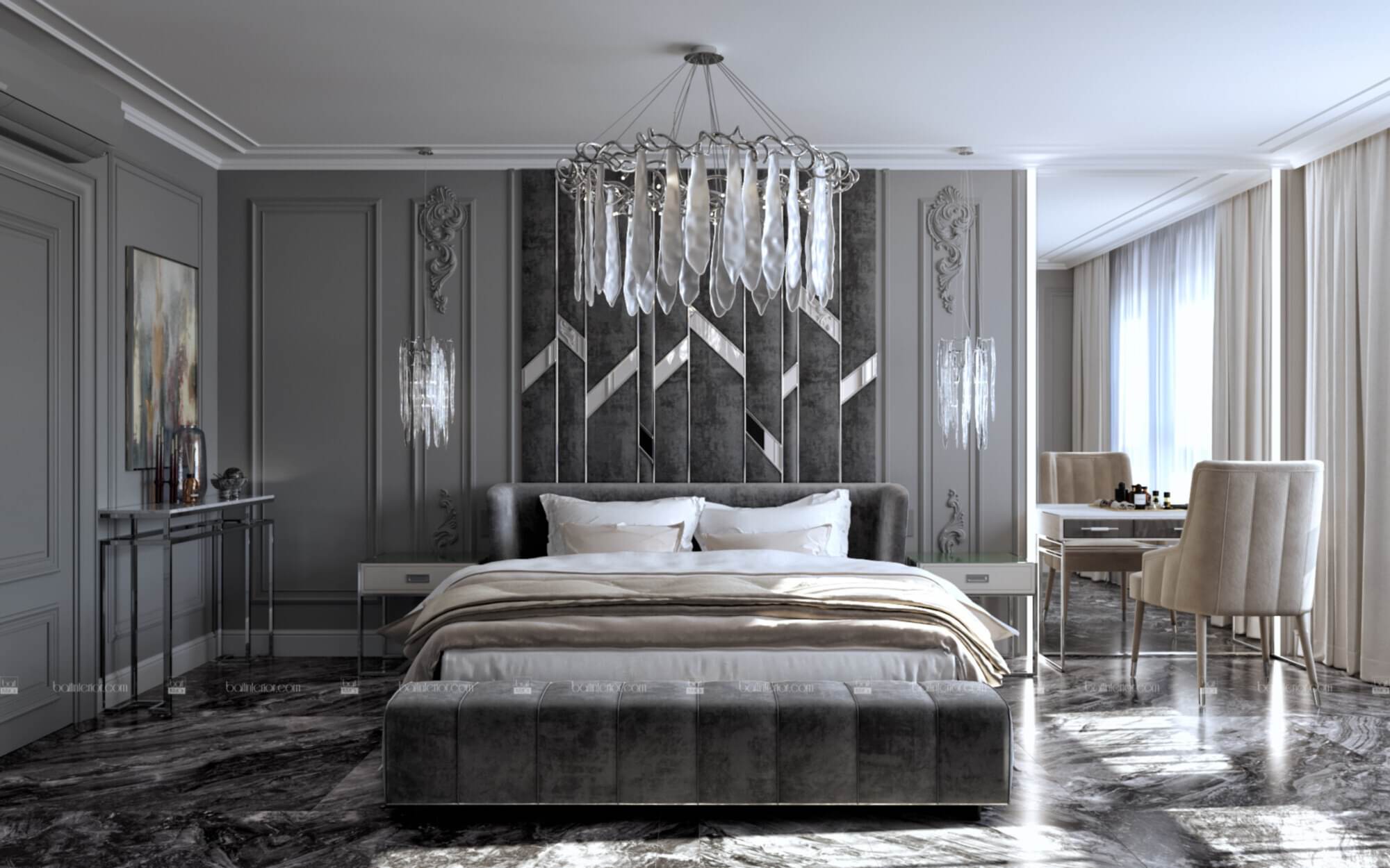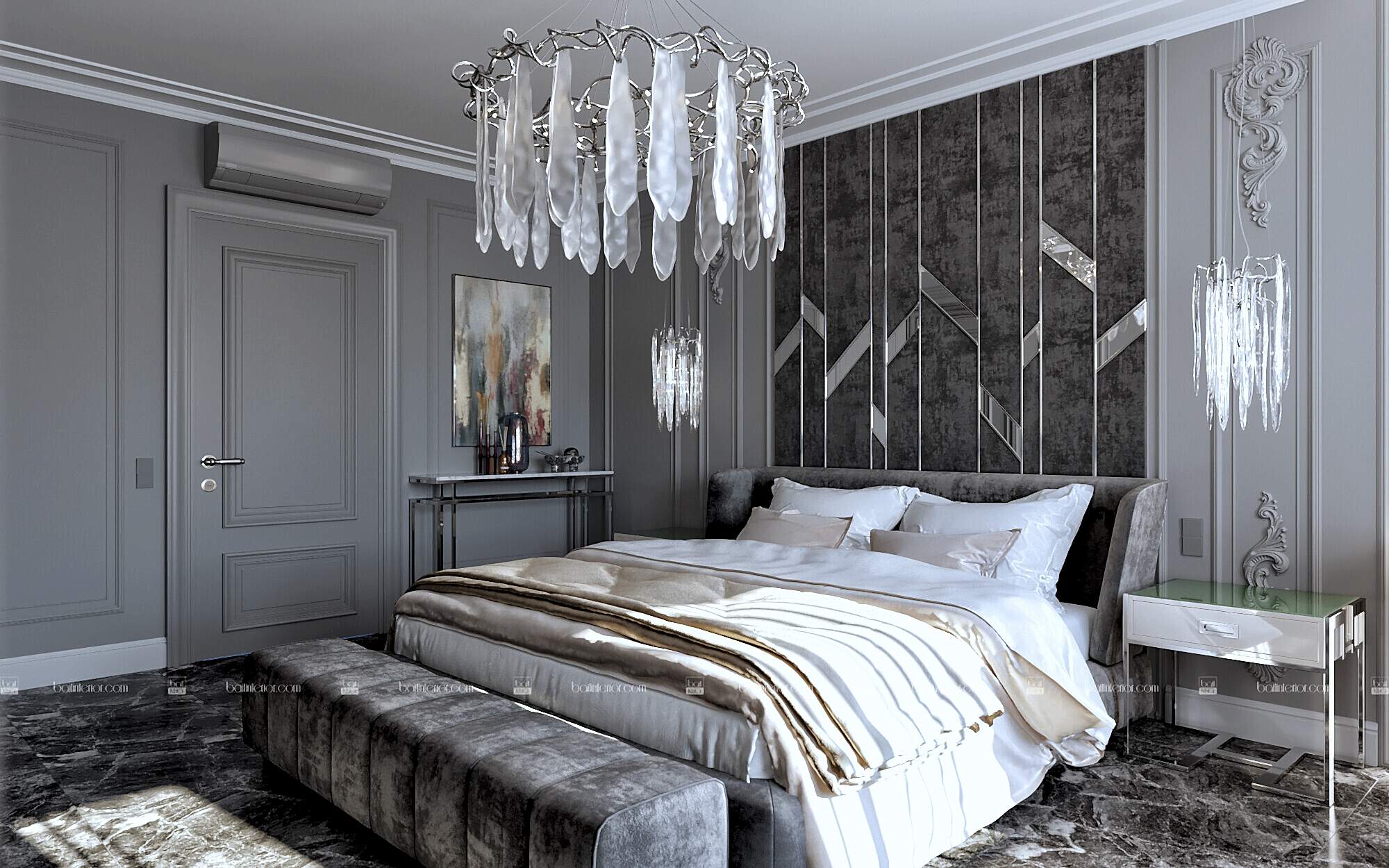 Спальня хозяев является продолжением гостиной, создавая единое стилистическое пространство, однако оттенок серого здесь более темный, что придает комнате атмосферу уюта и интимности. Этот переход в цветовой гамме способствует Pin-Up спокойной и расслабляющей обстановки, идеально подходящей для отдыха. Дополняют образ спальни изящные элементы декора и мягкое освещение, усиливающее эффект глубины и теплоты.
