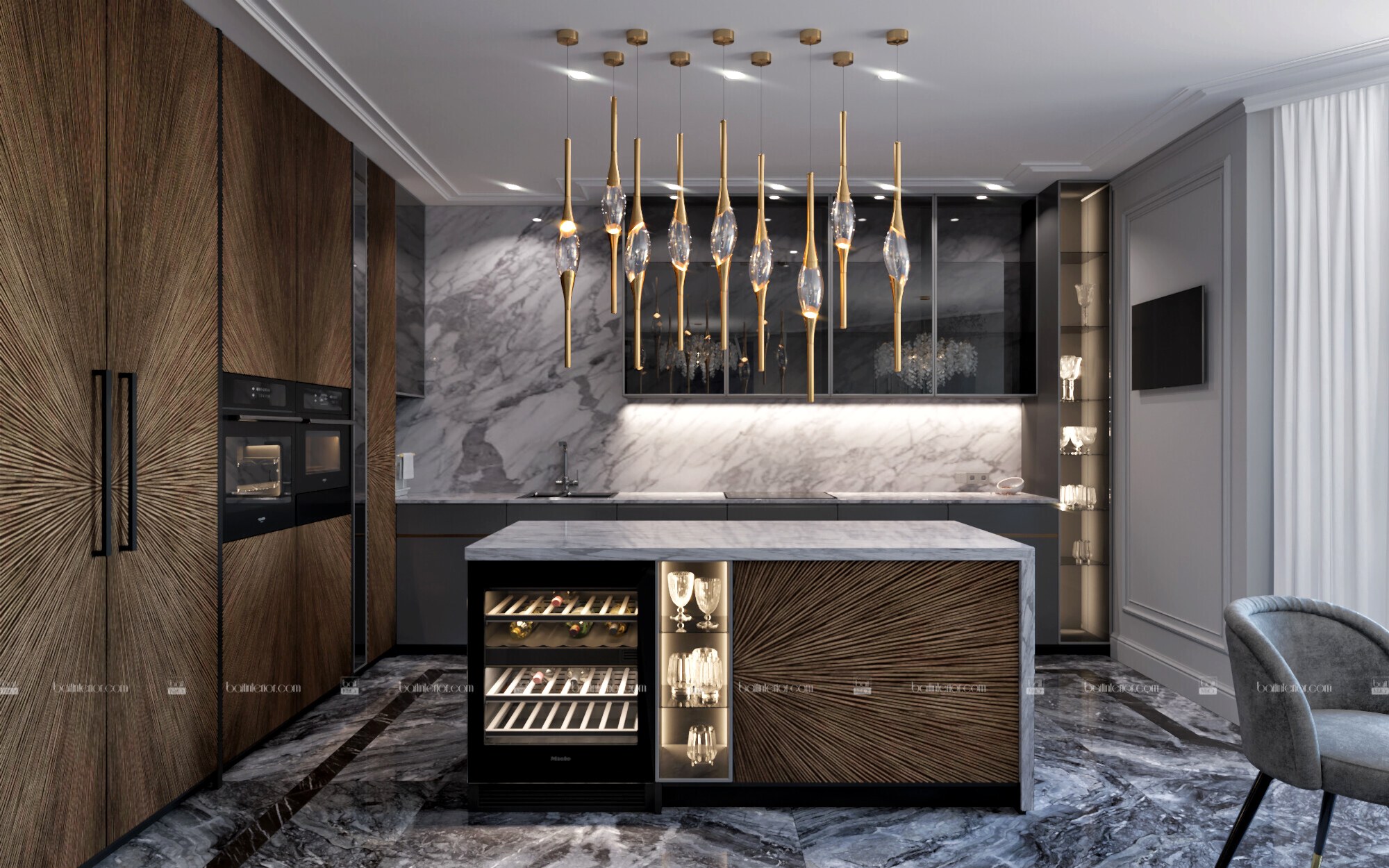 Кухня достаточно проста по форме, однако фасады из шпона с ручной радиальной раскладкой свидетельствуют о тонком вкусе заказчиков и притягивают Pin-Up внимание в этой зоне, создавая атмосферу изысканности и элегантности.